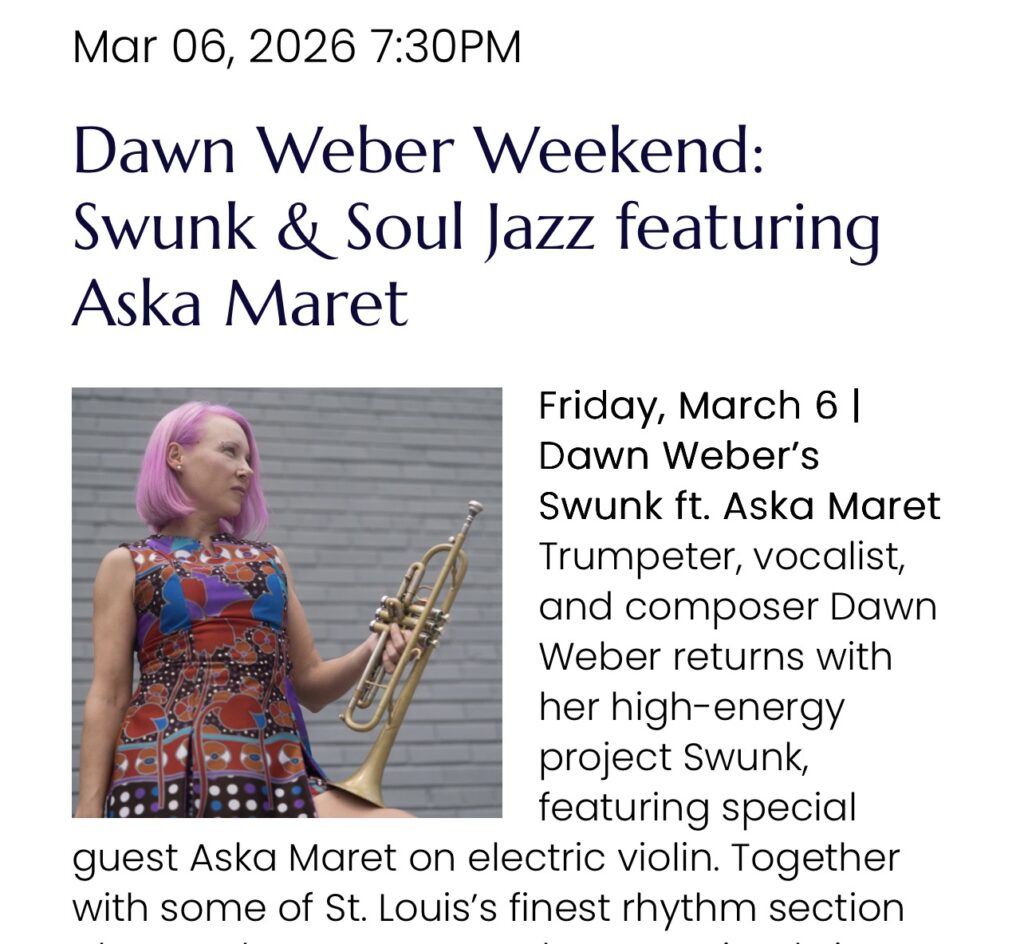 Dawn Weber weekend Swunk & Soul Jazz feat. Aska Maret @ Jazz St Louis (3/6 “SWUNK” 3/7 “ Soul Jazz “ ) Info & Ticket https://my.jazzstl.org/4226/4257 Dawn Weber (Trumpet & Vocal) , Aska Maret ( Electric Violin) , Eric Slaughter (Electric Guitar) , Colin Trusedell (Acoustic and electric Bass) , […]