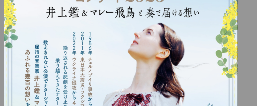 ウクライナの歌姫 ナターシャ・グジーコンサート2026 受付開始! ~ 井上鑑&マレー飛鳥と奏で届ける想い ~ *English below 5/28 (木)@かつしかシンフォニーヒルズ アイリスホール 出演  ナターシャ・グジー(歌・バンドゥーラ) ゲスト: 井上鑑(Pf.) マレー飛鳥(Vln.) 開場17:30 開演18:00 (終了予定20:00) Ticket 5,500円(全席指定) ※未就学児は入場できません お申し込みは、 お申し込みフォーム より Concert of Ukrainian Songstress Nataliya Gudziy 2026 — Ticket Sales Now Open! *~ A heartfelt evening brought to life with Akira Inoue & Aska Maret Performers Nataliya Gudziy (Vocal & Bandura) Guests: Akira Inoue (Piano), Aska Maret (Violin) Open: 5:30 pm Show: […]